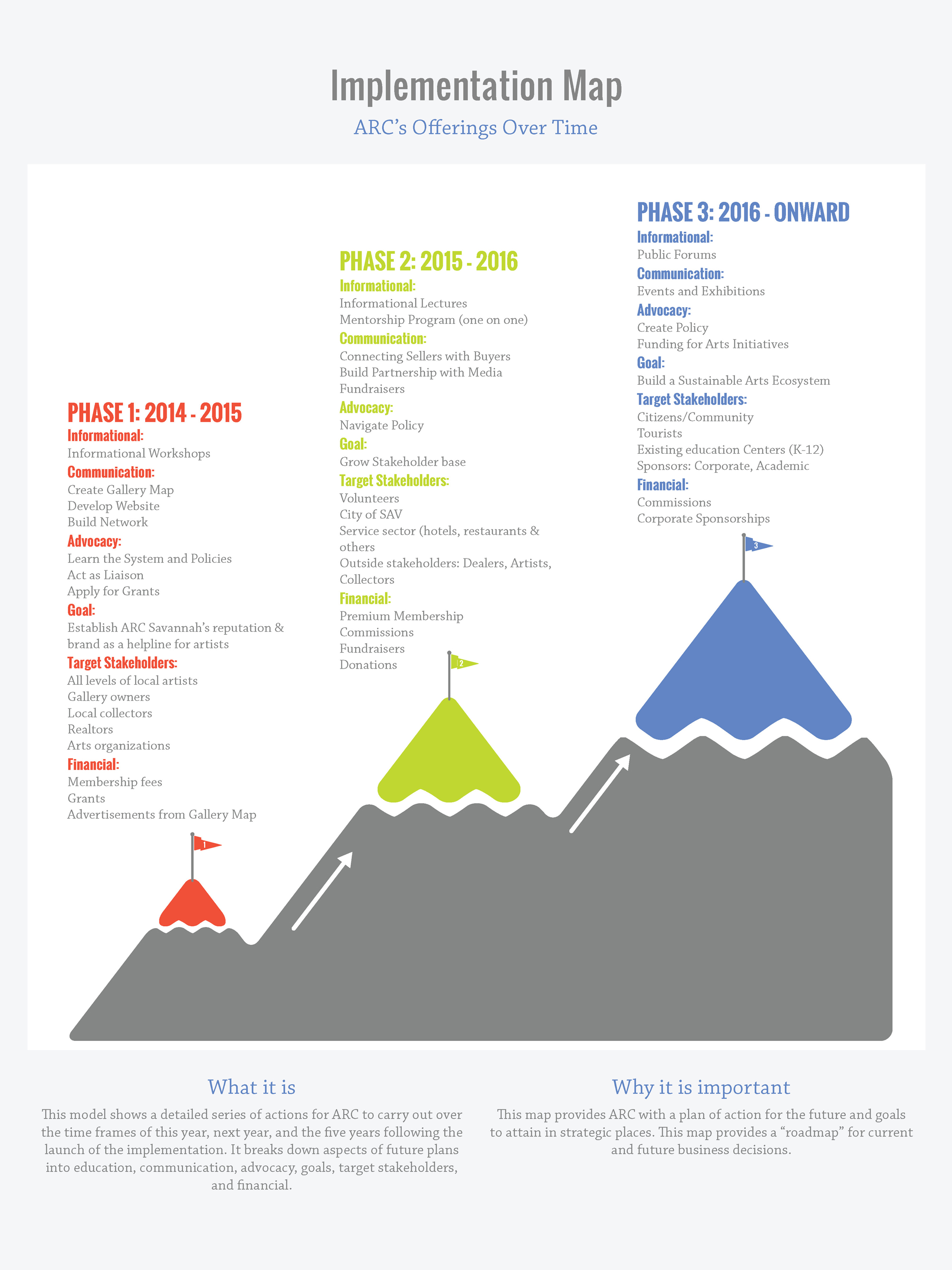 This model shows a detailed series of actions for ARC to carry out over the time frames of this year, next year, and the five years following the launch of the implementation. It breaks down aspects of future plans into education, communication, advocacy, goals, target stakeholders, and financial. This map provides ARC with a plan of action for the future and goals to attain in strategic places. This map provides a “roadmap” for current and future business decisions.
